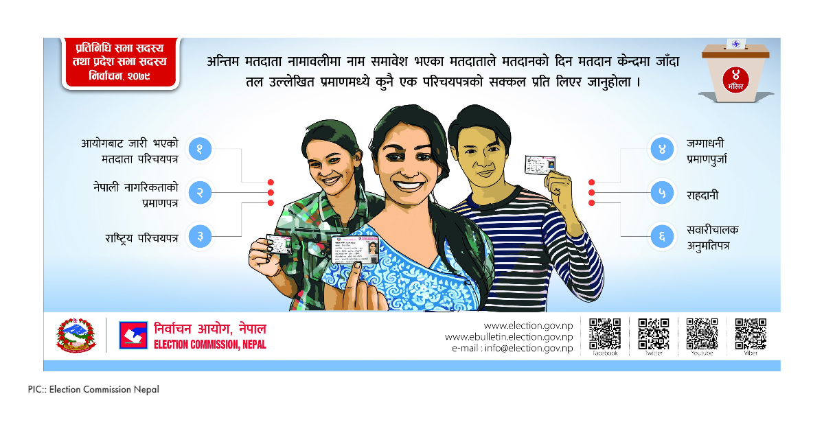 मतदानका लागि आयोगबाट जारी परिचयपत्रका साथै नेपाली नागरिकताको प्रमाणपत्र, राष्ट्रिय परिचयपत्र, जग्गाधनी प्रमाणपुर्जा, राहदानी वा सवारी चालक अनुमतिपत्रमध्ये कुनै एकको सक्कल प्रति देखाएर मतदान गर्न सकिनेछ।